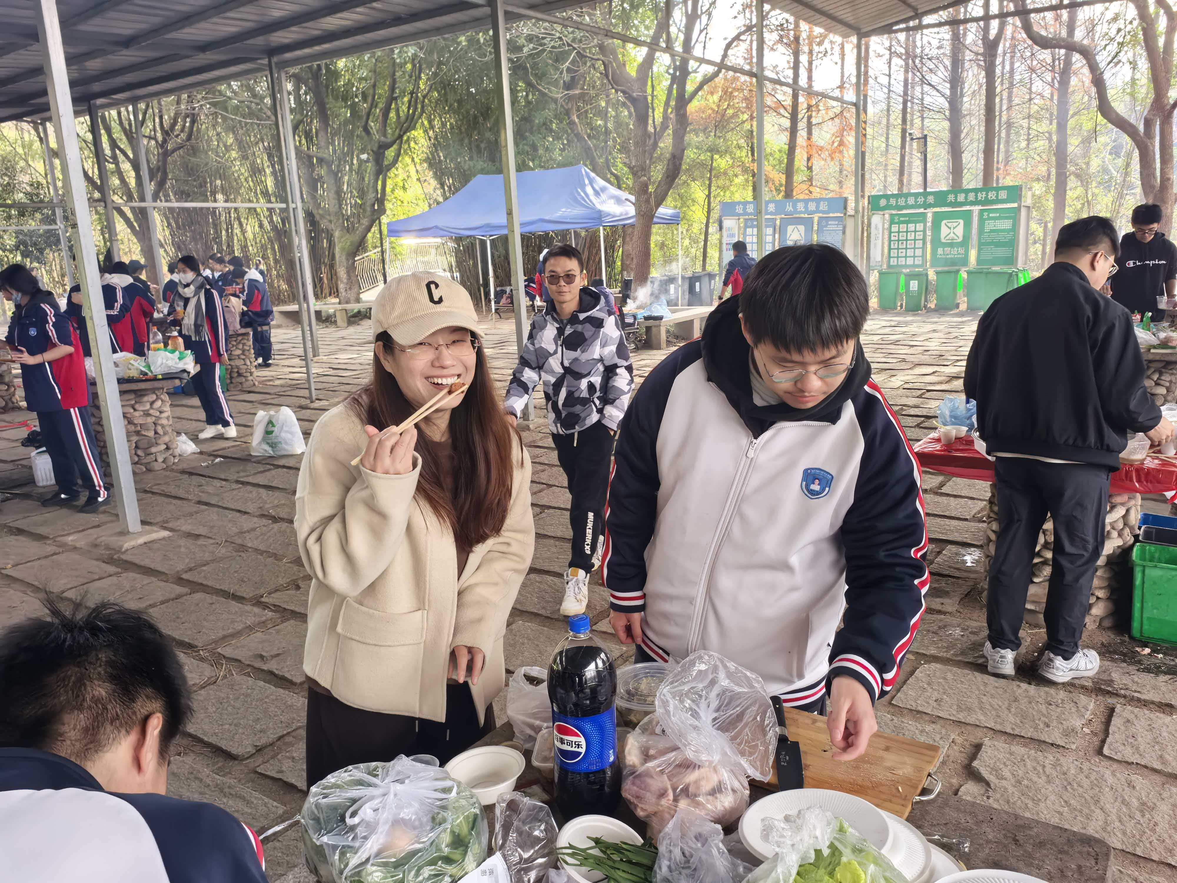 老师们也加入了这场烟火盛宴。不同于课堂上的严谨,老师们拿起锅铲的瞬间,塑造了同学们眼中最鲜活的“反差萌”:翻炒、调味、装盘,熟练的动作让同学们忍不住围在灶台边惊叹“原来老师还有这手艺”。当老师们把刚出锅的美食递到学生手里,一句“尝尝我的手艺”,让师生间的距离在烟火气里悄然拉近。