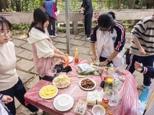 还有不少同学是第一次掌厨,只见他们小心翼翼地用菜刀处理着手中的食材,又手忙脚乱地将食材下锅,动作虽不娴熟,但依旧掩饰不住满眼的兴奋。在腾腾热气中,24道班级菜品依次亮相——酥脆的炸物、鲜美的热炒、焦香的烤串……灶台边的笑闹声、食物的滋滋声,让实践基地成了最热闹的“厨房”。