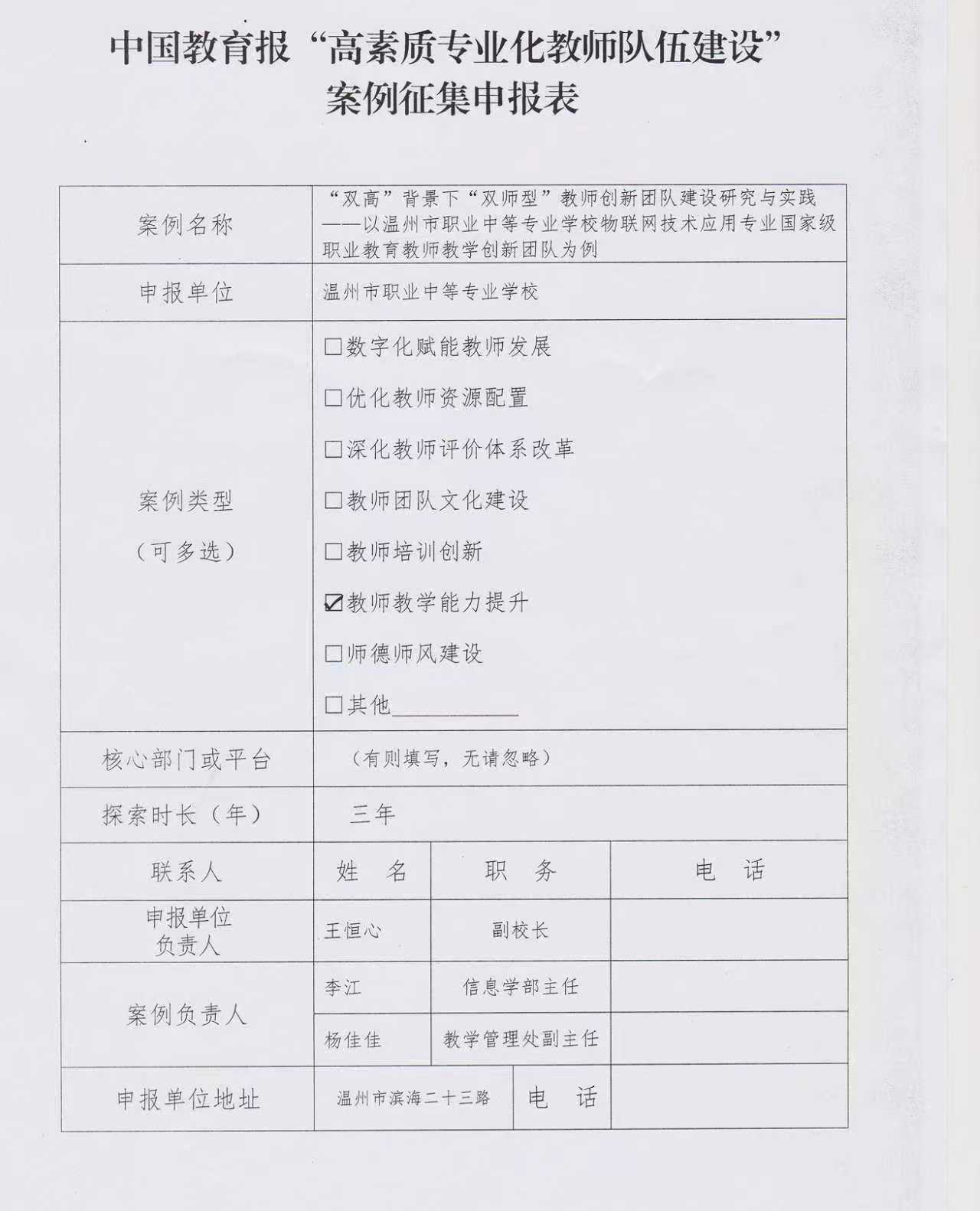 该案例由学校副校长王恒心担任单位申报人,信息学部主任李江、教学管理处副主任杨佳佳担任案例负责人,立足学校物联网技术应用专业国家级职业教育教师教学创新团队建设实践,紧扣职业教育“双高”建设核心要求,聚焦“双师型”教师队伍培育的痛点与难点,系统探索了新时代职业院校“双师型”教师创新团队的建设路径、培育模式与实践方法。案例中凝练的建设经验,将专业发展与教师成长深度融合,把产业需求与教学实践紧密对接,形成了可复制、可推广的“双师型”教师团队建设温州方案。